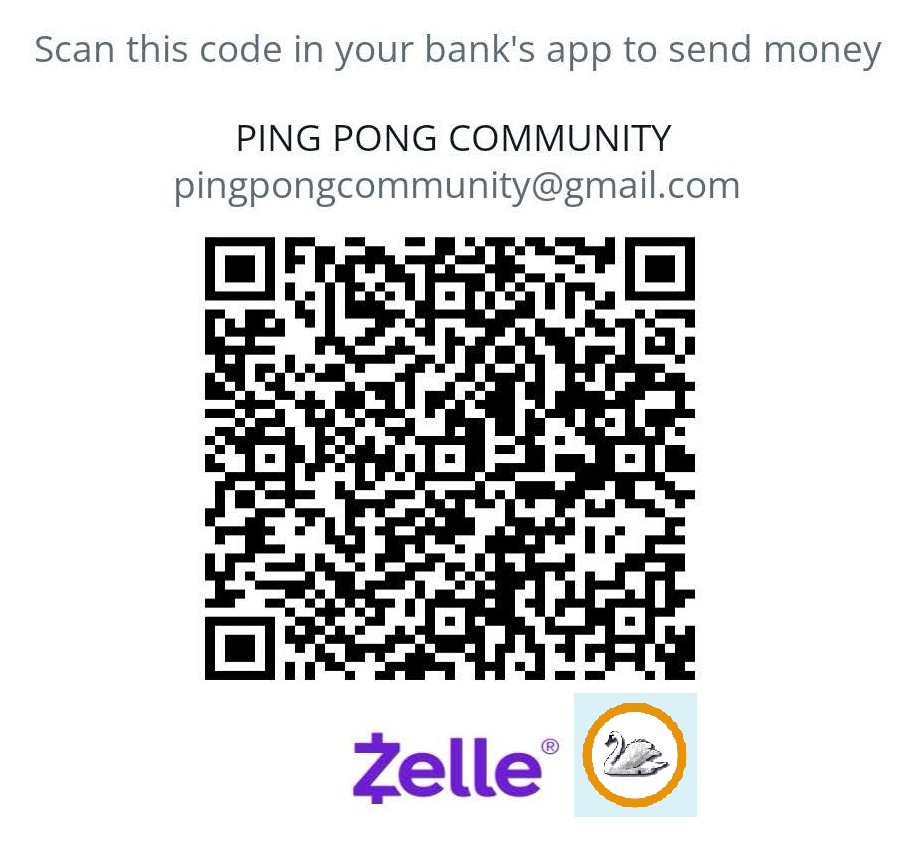 Ping Pong Community 3273 Falerno Way, San Jose, CA 95135 Tel: 408-915-7464 Email: pingpong.community@gmail.com EIN: 81-2451936 Paypal: pingpong.community@gmail.com Zelle: pingpong.community@gmail.com Venmo: @SWANPPC QRCode: